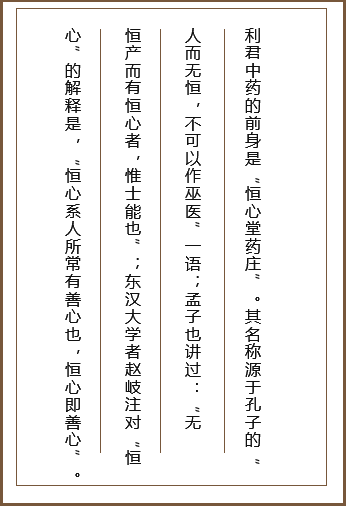 利君中藥具有近400年的悠久歷史。公司前身“恒心堂藥莊”始創(chuàng)于明朝末期,興盛于清代、民國(guó),其招牌產(chǎn)品“坎壢妙濟(jì) 丹”、“參茸固本還少丹”功能獨(dú)特、療效神奇,享譽(yù)廣大西部地區(qū),有“神農(nóng)妙濟(jì)”之美譽(yù),歷代名人左宗棠、于佑任、 屈武等都留有書(shū)聯(lián)贊譽(yù)。民國(guó)時(shí)期,“恒心堂”在西北5省及山西、四川、云南均設(shè)有分號(hào),坐大西部藥界,同北京“同仁 堂”、浙江“胡慶余堂”、廣州“陳李記”一起,被稱(chēng)為“四大藥莊”,是國(guó)內(nèi)為數(shù)不多的幾家具有數(shù)百年歷史的中藥“老 字號(hào)”之一。